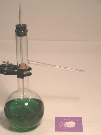This distillation kit comes with a 500ml distilling flask with a side arm, a number 5 rubber stopper with a hole, a thermometer that ranges from 0-300 Fahrenheit, and approximately one gram of boiling chips (aluminum oxide, boileezers). Distillation is a widely used method for separating mixtures based on differences in the conditions required to change the phase of components of the mixture. To separate a mixture of liquids, the liquid can be heated to force components, which have different boiling points, into the gas phase. The gas is then condensed back into liquid form and collected.